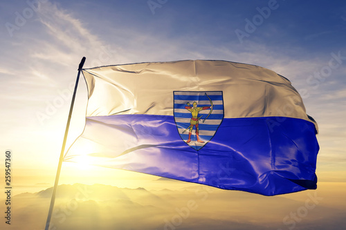 Balti city of Moldova flag waving on the top sunrise mist fog