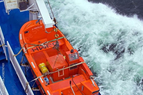 BALTIC SEA, FINLAND - OCTOBER 10, 2015.A top view on orange lifeboat on the deck of a ship sailing in the Baltic sea and foam in water.