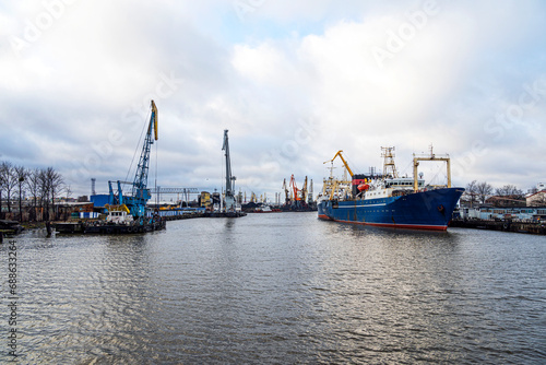 Baltic Sea. Many tall cargo cranes barges and ships, stand on the banks of River.