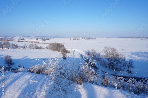Baltic sea shore in winter. Steep descent to water against blue sky. Steep river bank. Sunny wintry landscape.