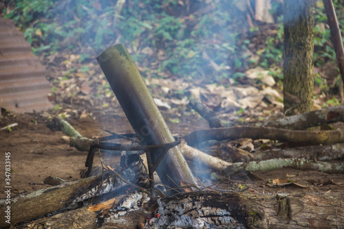bamboo burn on fire for food boiled cooking nature