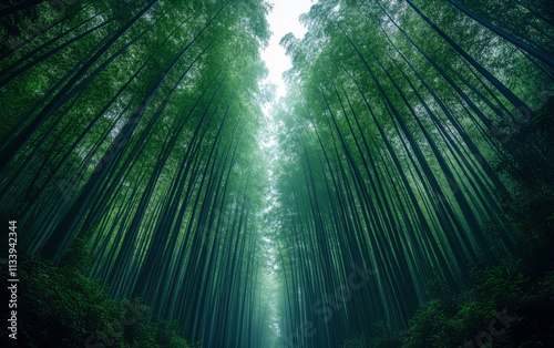 Bamboo forest pathway under soft sunlight filtering through tall trees