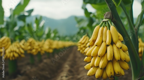 Banana bunches growing, cultivated field, mountains background, food production, agriculture