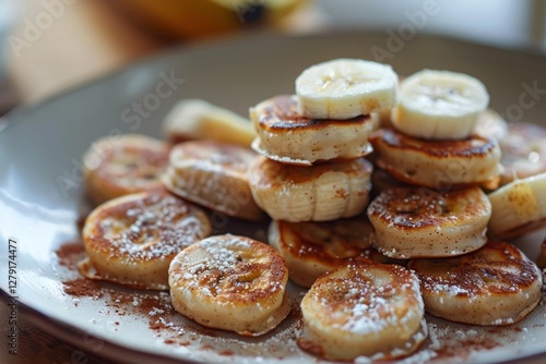 Banana pancakes with cinnamon on plate, warm tones. Neural network AI generated