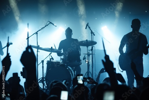 Band silhouette performing on stage drummer playing audience with lighters and phones