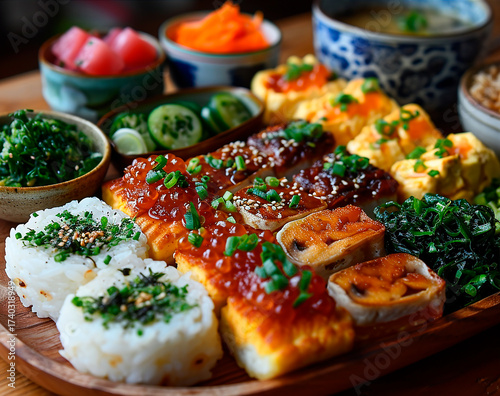 Bandeja de desayuno o almuerzo asiático con arroz, tofu y guarniciones