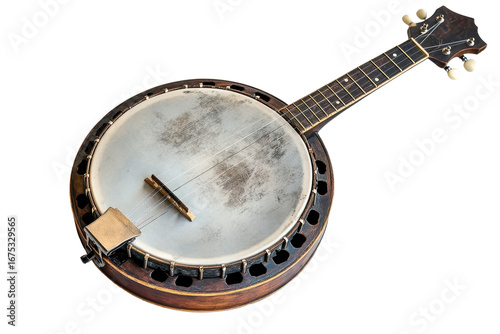 Banjo guitar string instrument displayed in a light setting for music enthusiasts and collectors, showcasing its unique design and craftsmanship with gigapixel clarity