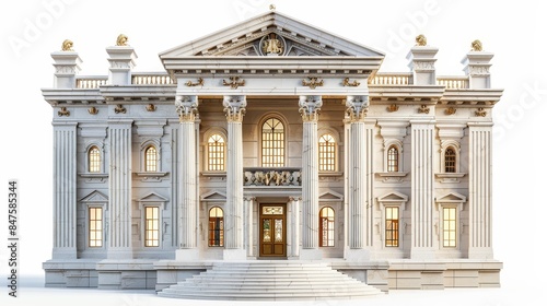 Bank building, 3D illustration, classical design, isolated on white background, vintage, detailed textures