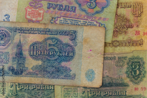 Banknotes of the USSR close-up. Old money of former Soviet Union