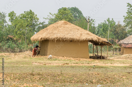 Bankura, West bengal,India.April 22, 2017. An unidentified village woman is working outside her mud house.