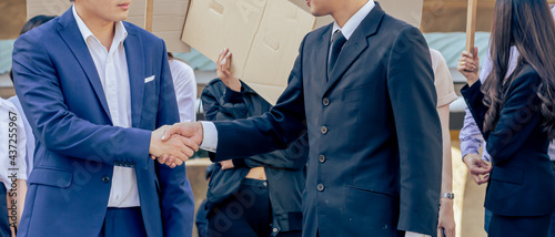 Banner and selective focus formal smart successful businesspeople making handshake for dealing agreement or contract with background of labor protestors for strike. Social Issue problem concept.