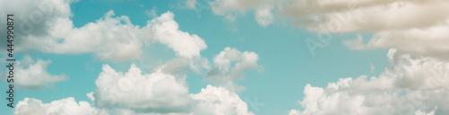 Banner. Background of a blue sky with large white clouds. Summer atmospheric background. Warm saturated colors