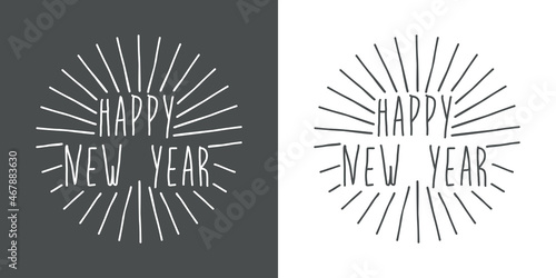 Banner con frase Happy New Year manuscrito con líneas en círculo en fondo gris y blanco, para su uso en invitaciones y tarjetas de felicitación