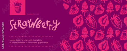 Banner design template with hand drawn illustrations of ripe strawberries vector. Strawberry pattern seamless. Red berries for vegan banner, juice, jam label design. Strawberry smoothie background.