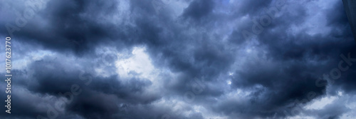 Banner Dramatic dark storm clouds black sky background. Dark thunderstorm clouds rainny season. Panorama Meteorology danger windstorm disasters climate. Dark cloudscape storm cloud with copy space.