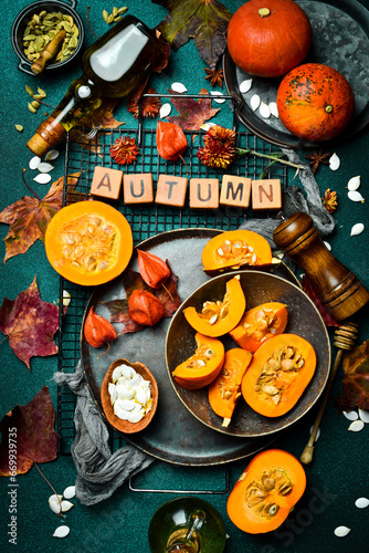 Banner: hello autumn. Orange pumpkins on a stone table, holiday decoration. Pumpkin menu. Top view.
