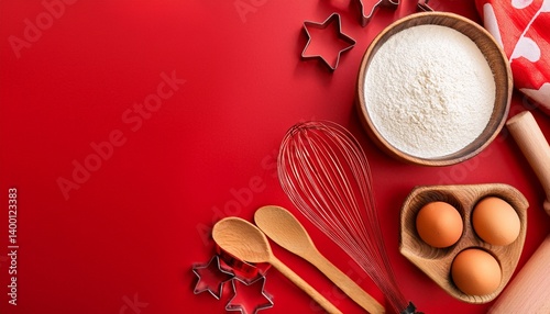 Banner made with baking ingredients and cooking utensil with copy space on red background. Template for your cooking design. Top view Flat lay Copy space. Generated image