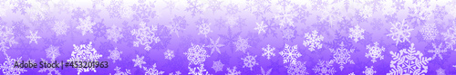Banner of complex Christmas snowflakes with seamless horizontal repetition, in purple colors. Winter background with falling snow