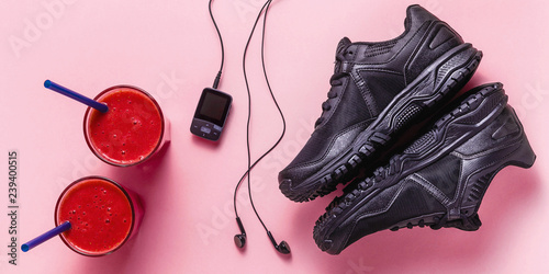 banner of red fresh fruit smoothies, mp3 player with headphones and black sneakers on a pink background. concept of youth, music, sport and health