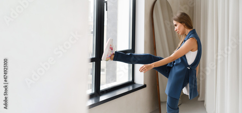 Banner Strong Caucasian woman happy in smart casual business costume. Daring fashion style portrait of female in light sunny room with window kicking. Modern energetic young girl moving in blue