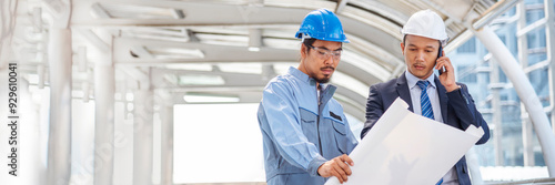 Banner Two engineer man look at blueprint architecture building contractor designer. Engineer holding project planing partner teamwork. Two Man meeting together construction site with copy space