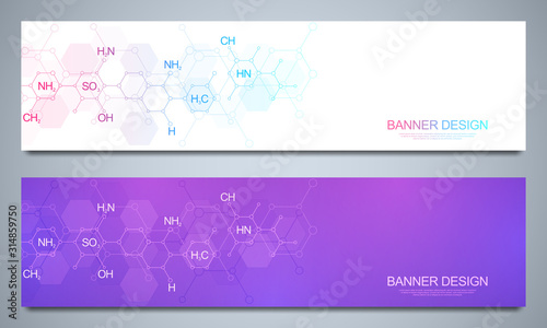 Banners design template and headers for site with abstract chemistry background and chemical formulas. Science and innovation technology concept. Decoration website and other ideas.