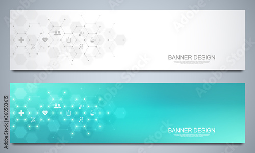 Banners design template for healthcare and medical decoration with flat icons and symbols. Science, medicine and innovation technology concept.