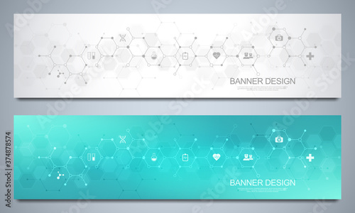 Banners design template for healthcare and medical decoration with flat icons and symbols. Science, medicine and innovation technology concept.