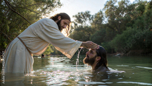 Baptism in a serene river setting with a man being blessed by Jesus