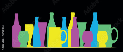 Bar, alcohol, silhouettes of beer bottles of different shapes, beer glasses. Vector illustration banner party, bright neon colors