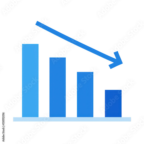 Bar chart showing a downward trend with a blue arrow isolated on transparent background