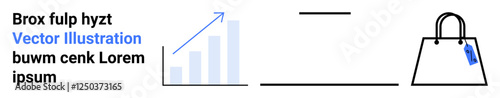 Bar chart with upward arrow, text blocks, and shopping bag with tag. Ideal for data analysis, trends, sales, shopping, retail, business growth and e-commerce flat landing page banner