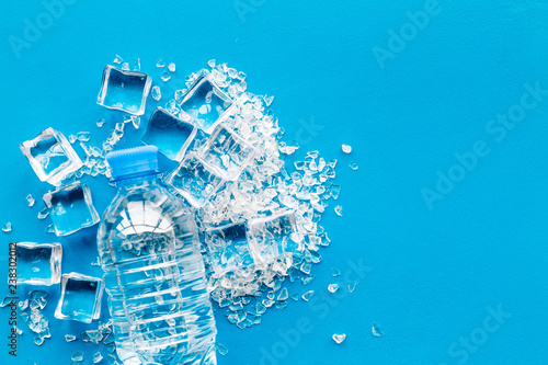 Bar desk with ice cubes and plastic bottle on blue background top view space for text