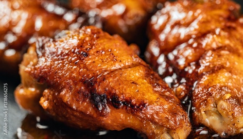 Barbecue chicken wings coated in a tangy glaze, highlighting the crispy skin and tender meat