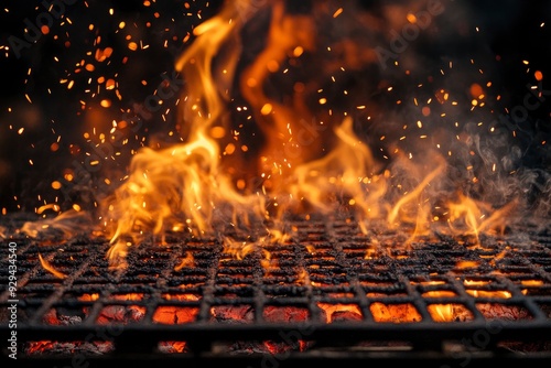 Barbecue Grill With Fire Flames - Empty Fire Grid On Black Background , ai