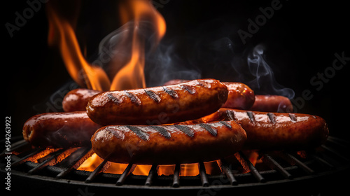 Barbecue juicy sausage on grill fire with smoke on black background. Copy space. Based on Generative AI