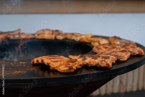 Barbecue, outdoor cooking, gastronomy, cookery, street food concept. Process of cooking fresh juicy meat steaks on brazier at summer local food market - close up view