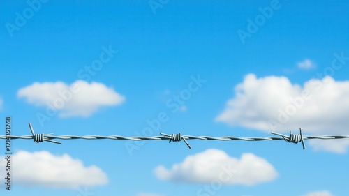 Barbed Wire Fence Against a Bright Blue Sky with Fluffy White Clouds