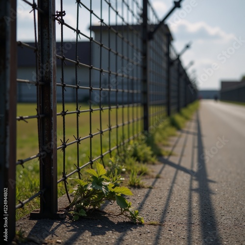 Barbed wire fences with long shadows outside a towering prison facility Dark Grim Intense