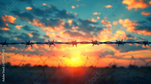 Barbed Wire Silhouette Against a Vibrant Orange Sunrise Offering a Symbol of Confinement and Hope