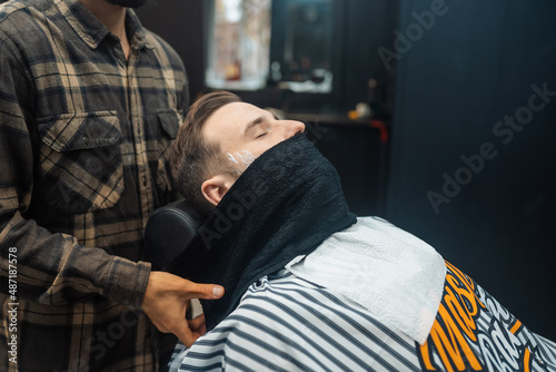 Barber preparing man face for shaving with hot towel in barber shop
