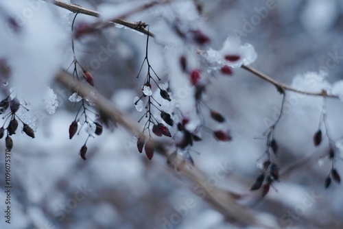 barberry branch with red berries in ice floes and snow after the first snowfall in late autumn in November macro shot on a vintage soviet lens