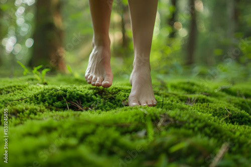 Bare feet walking slowly on soft moss in forest m