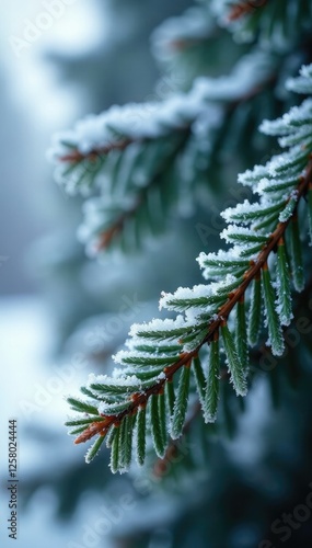 Bare fir branches frost over with ice crystals, frozen, rime, branch