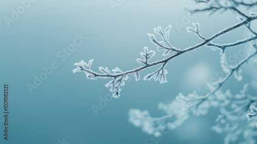 Bare, frosted branches with minimal white frost on a pastel blue background.
