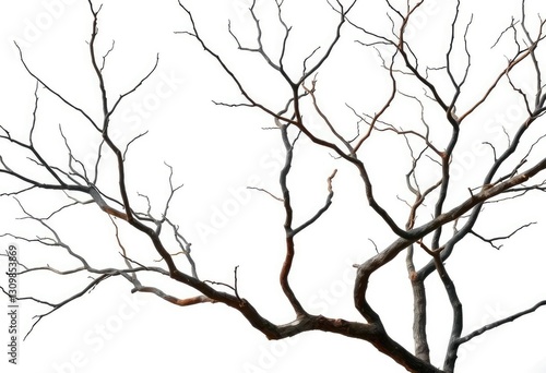 Bare, gnarled branches isolated against a pure white backdrop, silhouette, clean