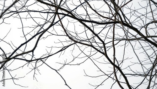 Bare, intertwined branches against a pure white backdrop, minimalist, organic