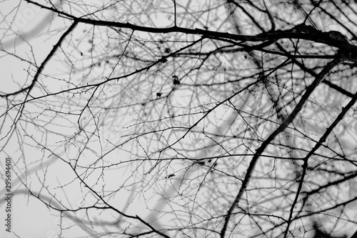 Bare scary branches of autumn-winter trees. Graphic black and white background