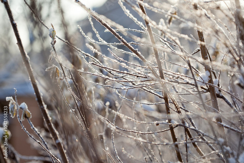 bare tree branches covered with frost and snow, close up, blurred background, cold but good mood