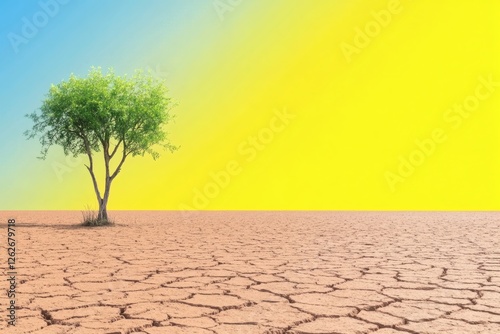 Bare tree stands alone on cracked earth under a bright yellow-blue sky at midday